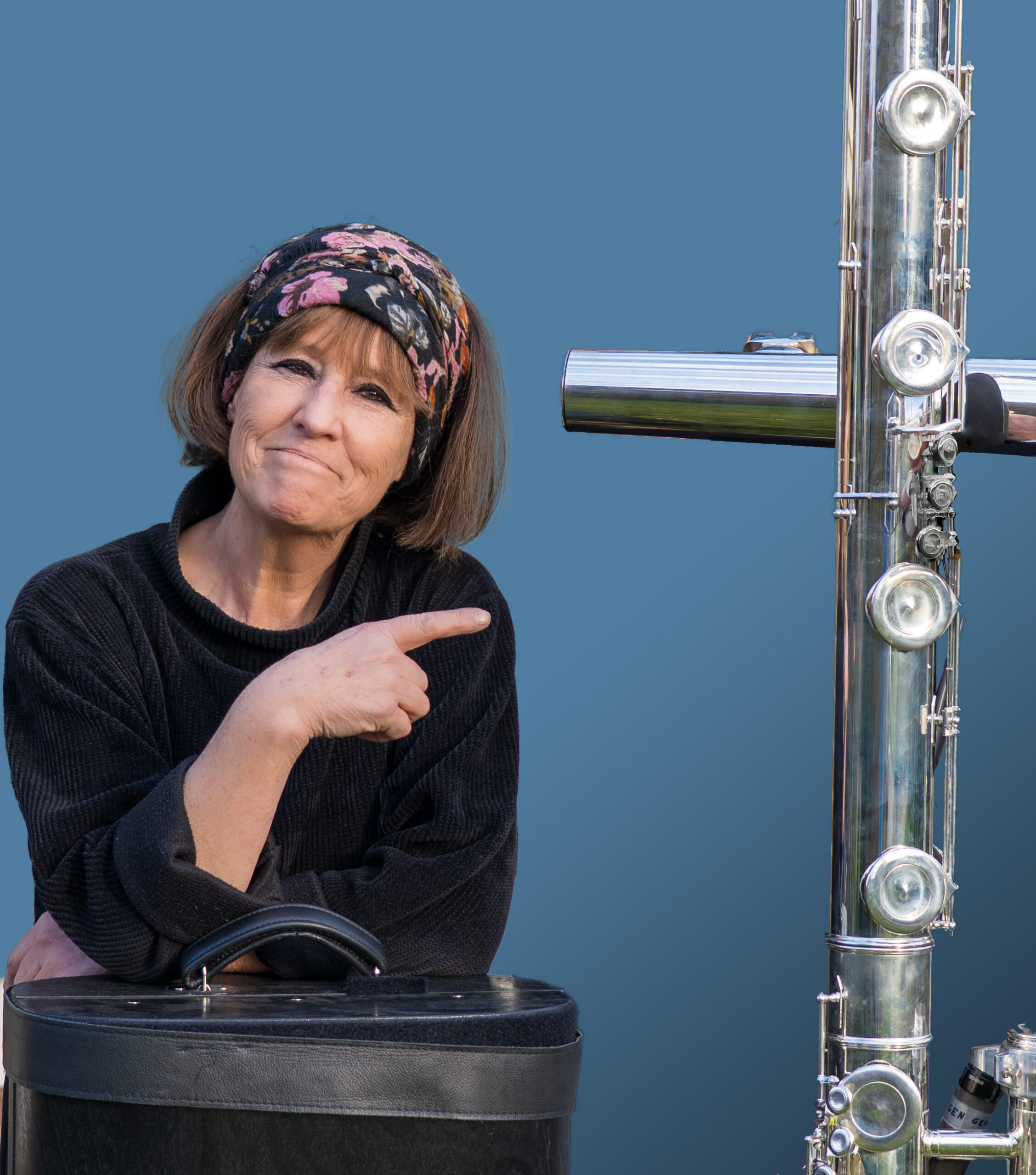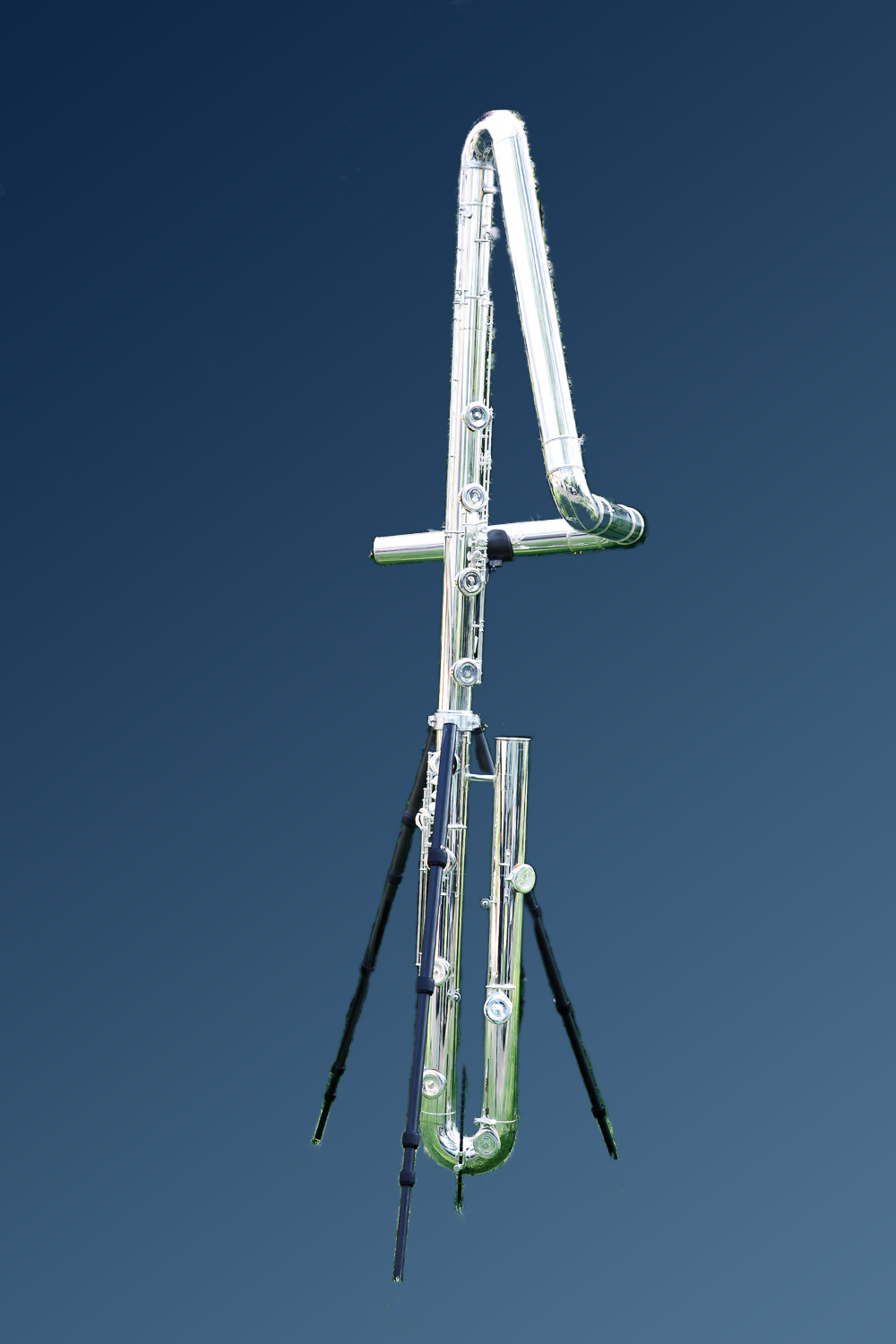 A Kingma Double Contrabass flute is silver plated. The instrument is delivered with a Wiseman case and a carbon fibre tripod stand. Although a bulky instrument with a total (stretched out) length of nearly 5 meters(!) it is has some elegance and it is still possible to bring it with you.